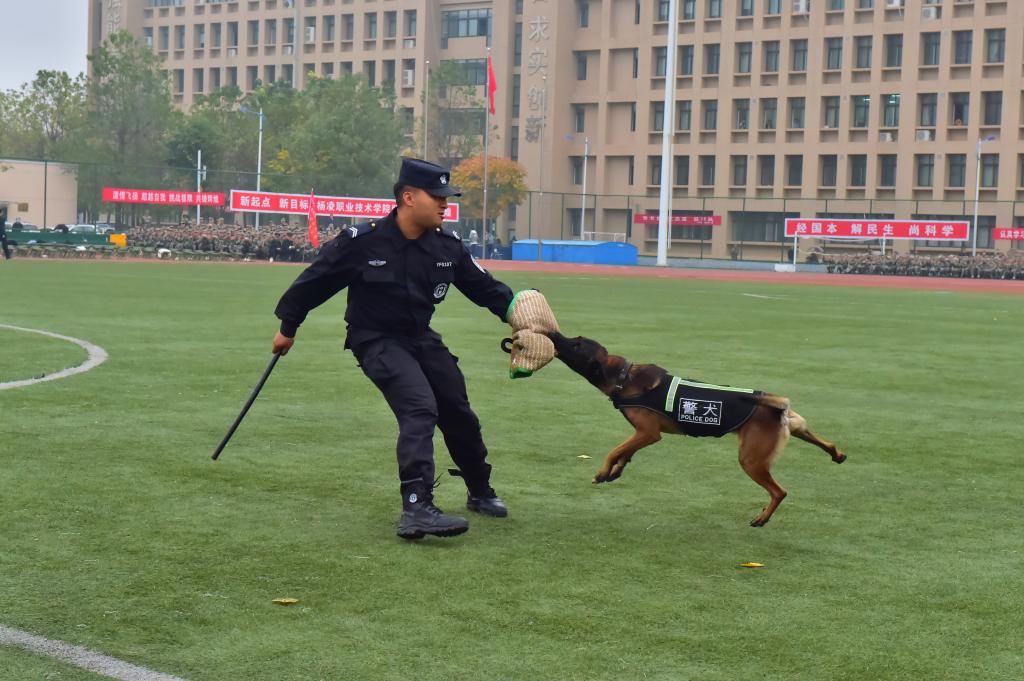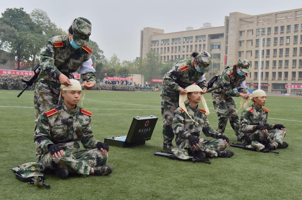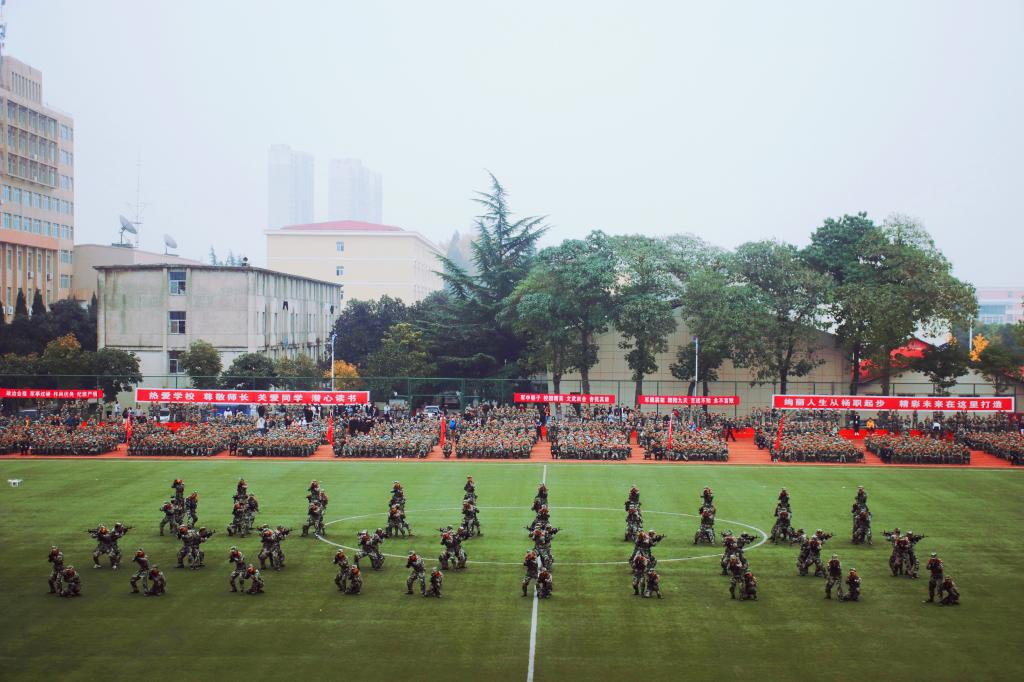 军训汇报表演暨总结表彰大会在庄严的国歌中拉开帷幕。参训学生精神抖擞、士气高昂,在教官们的统一指挥下,进行了会操表演,并表演了军体拳、警棍盾牌术、匕首操、战术动作及战场救护、旗语等单项科目,展示了14天的军训成果。