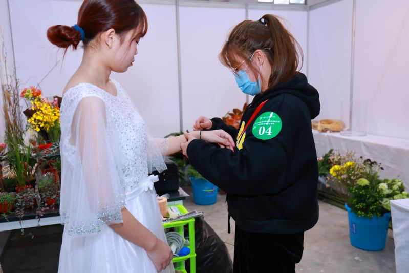 “花艺”赛项共有来自全省10所高职院校10名选手参赛。涵盖中国传统插花与现代花艺两个方向,要求选手在规定的时间内,完成9件花艺作品。考核内容涵盖插花艺术风格、花型结构、造型设计、色彩配置、花材整理与加工、花材保鲜等知识与技能。要求考生了解花艺行业最前沿的设计思想和理念,具备创新发展的思路和创造能力,掌握插花创作的各种要素以及各要素之间的配置方法,能熟练运用给定花材与辅材进行作品的设计和制作。充分考验高职学生掌握中国传统插花与现代花艺相关的设计创意、立体结构、色彩组合、植物搭配的认知能力、审美鉴赏能力和动手制作的技术技能水平。