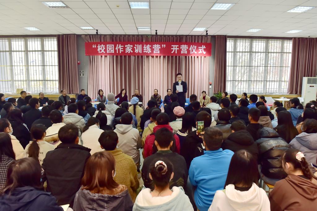 11月21日下午,beat365官网“校园作家训练营”在西校区图书馆举行开营仪式。副校长祝战斌致辞,图书馆馆长王红相、文理分院院长王云江,中国作协、省作协十位作家,以及部分教师代表、团委《职苑文艺》编辑部、各二级学院文学社成员共300余人参加了开营仪式。仪式由学工部副部长、团委书记陈吼主持。