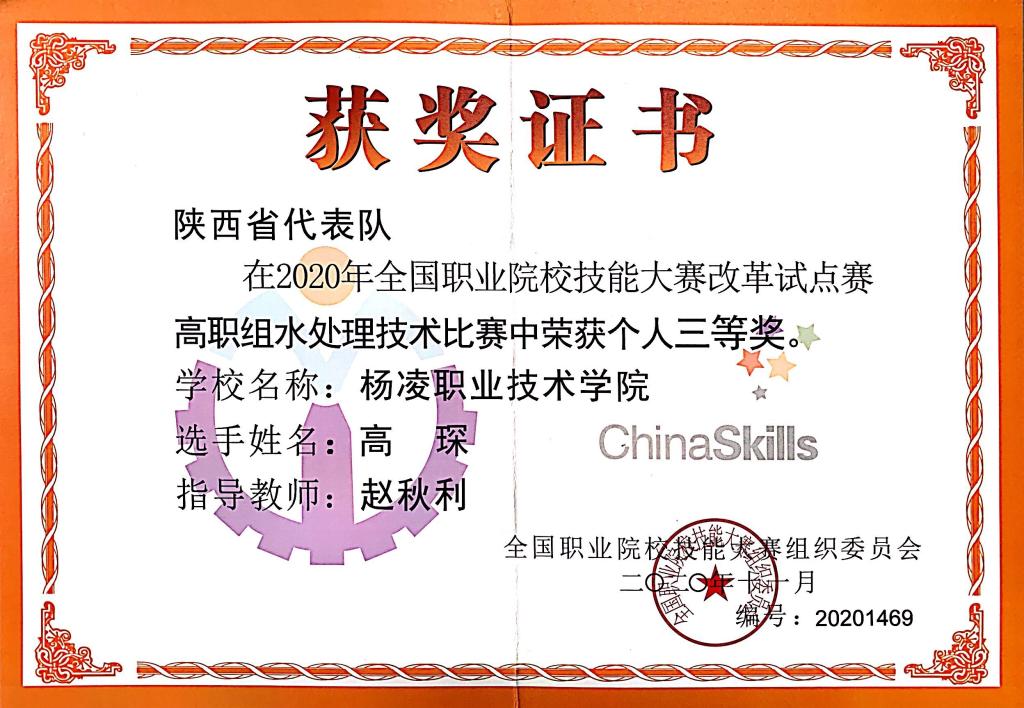 11月27日、28日,2020年全国职业院校技能大赛改革试点赛高职组“水处理技术”赛项在山东科技职业学院举办,来自全国各地29支代表队参赛,beat365官网生态环境工程分院学生高琛荣获比赛个人三等奖。