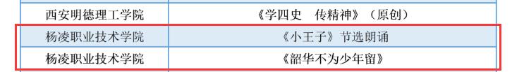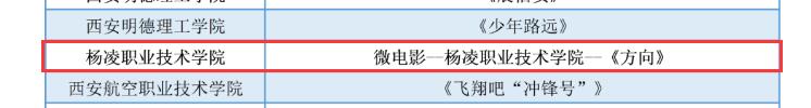 在第五届“陕西高校大学生网络文化节”活动中,由党江薇、张春彦、杨义红等创作的《中国很赞》和由党江薇、郭欢欢、白雪阳创作的《习惯与改变》被评审为微视频类优秀作品,由李欲强、李可可、张明亮创作的《方向》被评审为微电影类优秀作品,由吴美娟创作的《烟雾缭绕不一定是天堂》被评审为公益广告类优秀作品,由张葭创作的《小王子节选朗诵》和张悦馨创作的《韶华不为少年留》被评审为音频类优秀作品,由党江薇创作的《梦想从这里起航》被评审为其他类网络创新作品优秀作品。