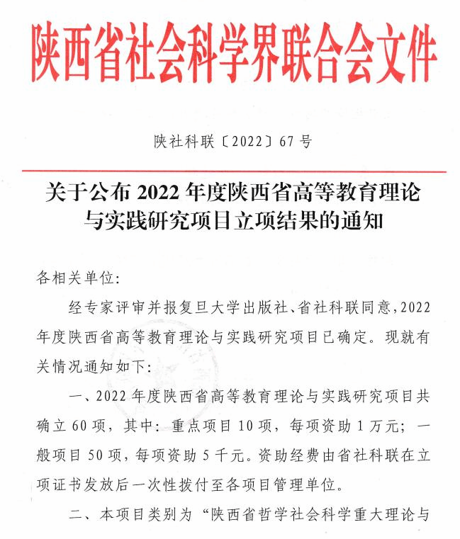 “2022年度陕西省高等教育理论与实践研究项目”是由陕西省社会科学界联合会与复旦大学出版社根据相关文件设立的专项项目,旨在进一步加强陕西省高等教育理论研究,提升陕西省高等教育理论研究水平,推动高等教育改革实践, 本年度共确立项目60项。