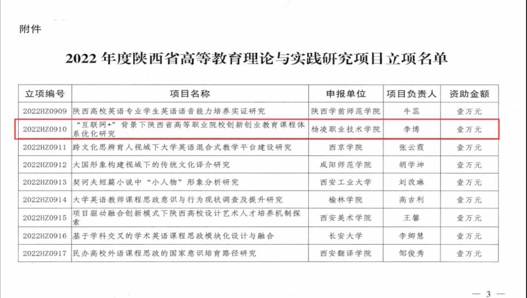 近日,陕西省社会科学界联合会发布文件,学校李博老师主持的项目《互联网+”背景下陕西省高等职业院校创新创业教育课程体系优化研究》获批立项重点项目,为省内唯一高职院校获批重点项目。