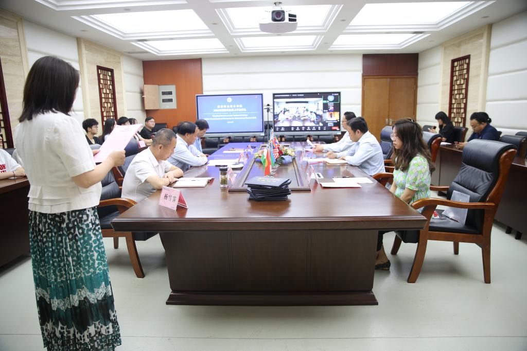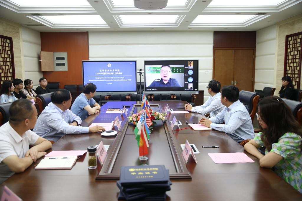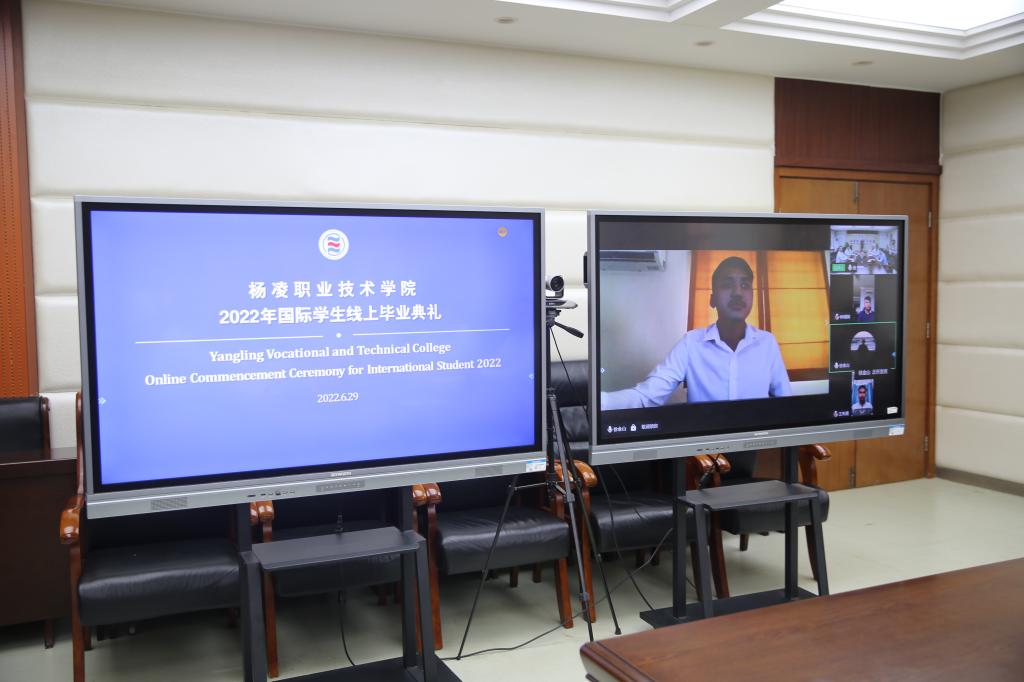 6月29日,杨凌职业技术学院2022年国际学生线上毕业典礼在南校区204会议室举行。校长王周锁,高山流水集团总经理徐小川(线上),副校长祝战斌、胡俊鹏,党委委员、宣传部部长裴红波,国际学院院长杜斌出席了典礼。国际学院教师及2019级全体国际学生毕业生(线上),国内学生代表等参加了典礼。国际学院副院长杨雪霁主持毕业典礼。