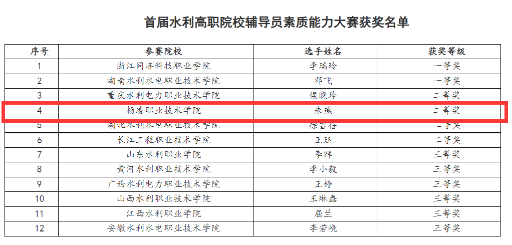 6月25至26日,由中国水利教育协会主办,浙江同济科技职业学院承办的首届水利高职院校辅导员素质能力大赛顺利举办,beat365官网辅导员朱燕以总位次第4的成绩获得二等奖。