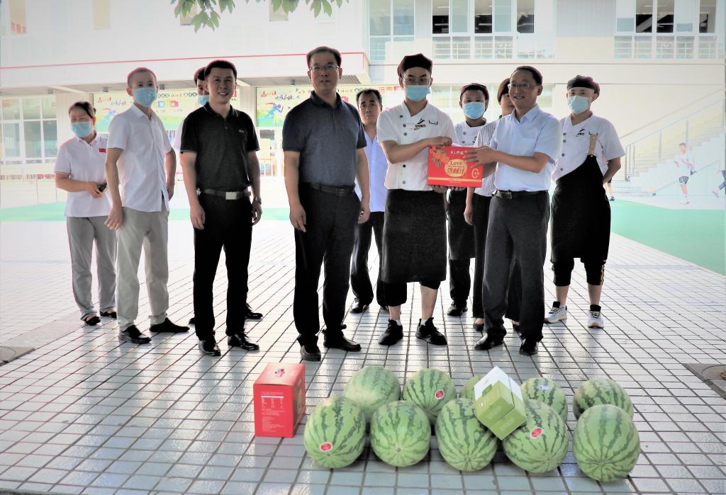 暑热炎炎,又到了一年的酷暑季节,为了对学校一线工作者在高温酷暑下依然坚守工作岗位的敬业奉献精神表达谢意,7月8日,校工会主席董育公看望并慰问了高温下依然坚守在岗位的门卫保安和食堂餐饮人员,为他们送去了清凉饮品和西瓜等慰问品。同时还为坚守在工作一线的教职工送去了清凉慰问品,并通过送清凉活动表达了学校对一线工作者的关怀和问候。