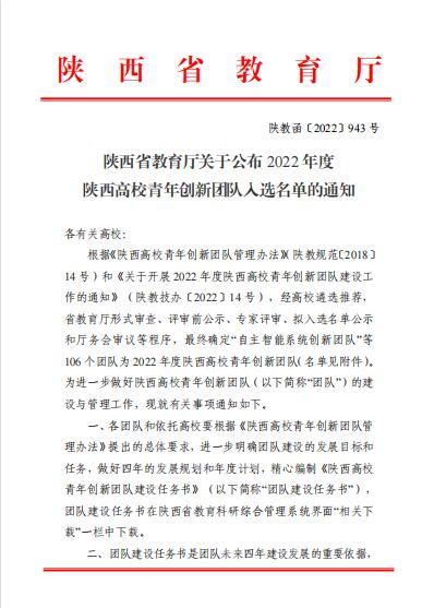 杨振华团队是beat365官网继2020年后第二个入选的陕西高校青年创新团队,将有力推动学校科技创新工作发展,支撑学校“双高计划”建设。