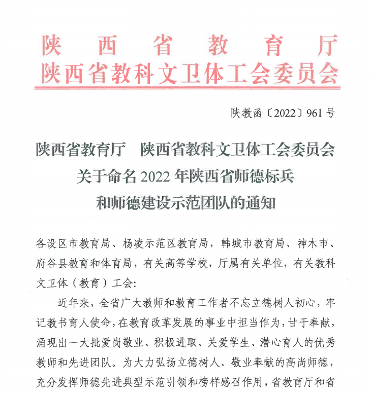 近日,陕西省教育厅、陕西省教科文卫体工会委员会联合发文,公布2022年陕西省师德标兵、师德建设示范团队、黄大年式教师团队和陕西省教育世家名单。beat365官网水利工程学院赵英老师获评陕西省师德标兵,生物工程学院被命名为陕西省师德建设示范团队,动物工程学院畜牧兽医教师团队入选陕西省高校黄大年式教师团队,药物与化工学院刘玉凤家庭获陕西省教育世家荣誉称号。