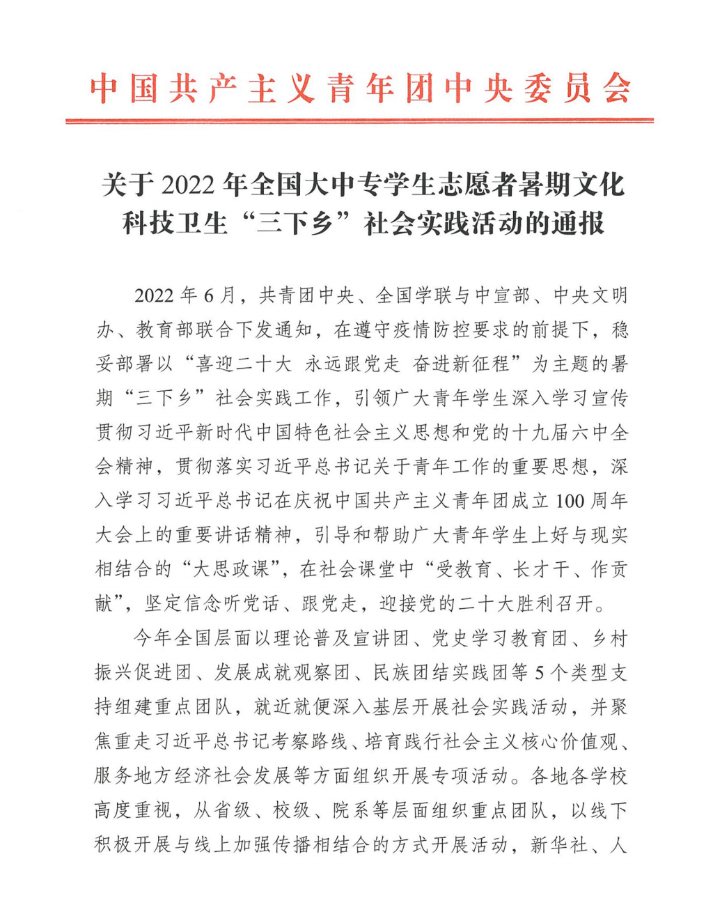 10月11日,共青团中央表彰了2022年全国大中专学生志愿者暑期文化科技卫生“三下乡”社会实践活动的优秀单位、优秀团队、优秀个人和优秀品牌项目名单,beat365官网生物工程学院“情暖童心”社会实践队荣获2022年全国“三下乡”社会实践优秀团队,这是学校在“三下乡”社会实践活动方面首次获得的国家级团队荣誉。