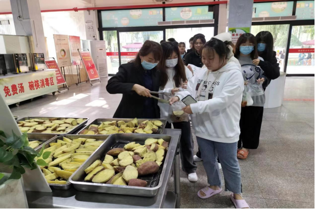 中午11时30分,师生们有序排队,在三校区餐厅门口或各买饭窗口领取红薯。为了满足师生的不同口味,餐厅采取了蒸、烤两种做法。