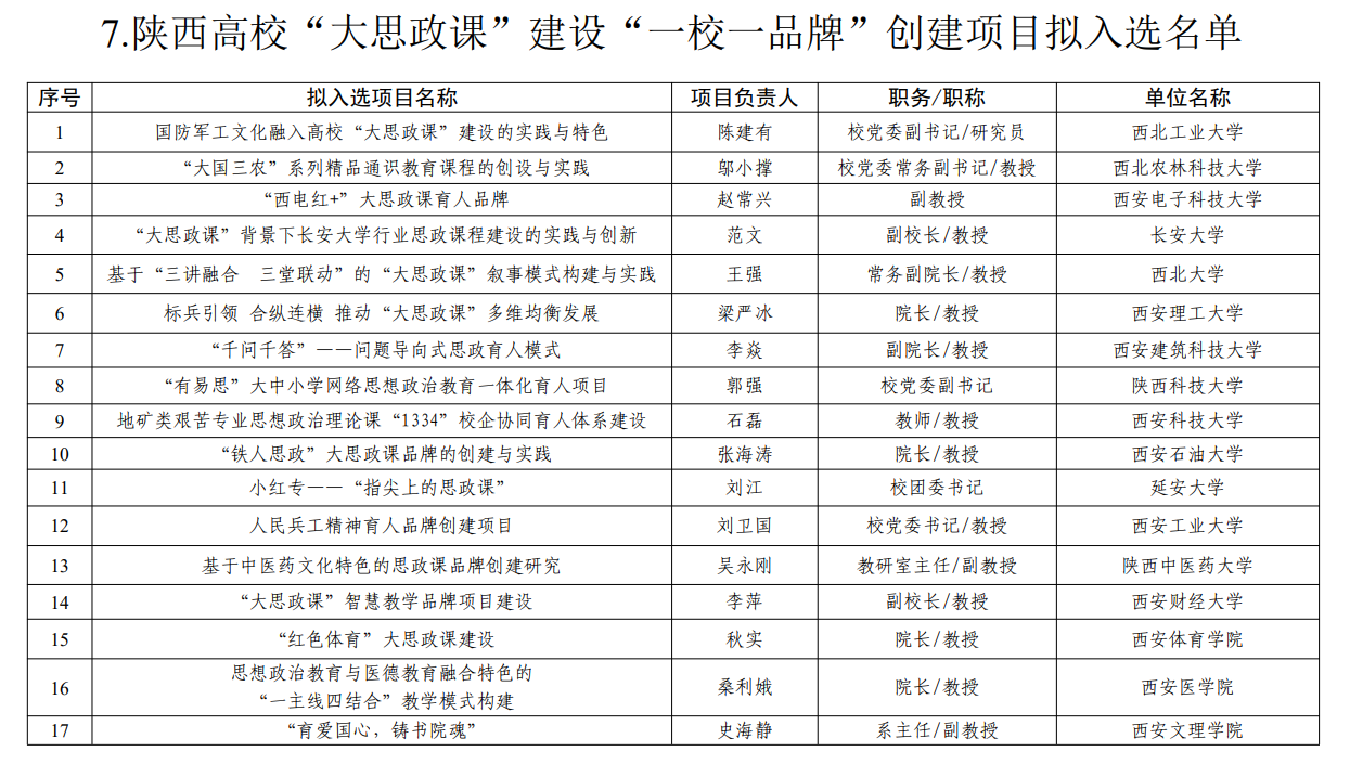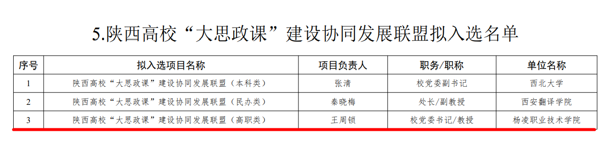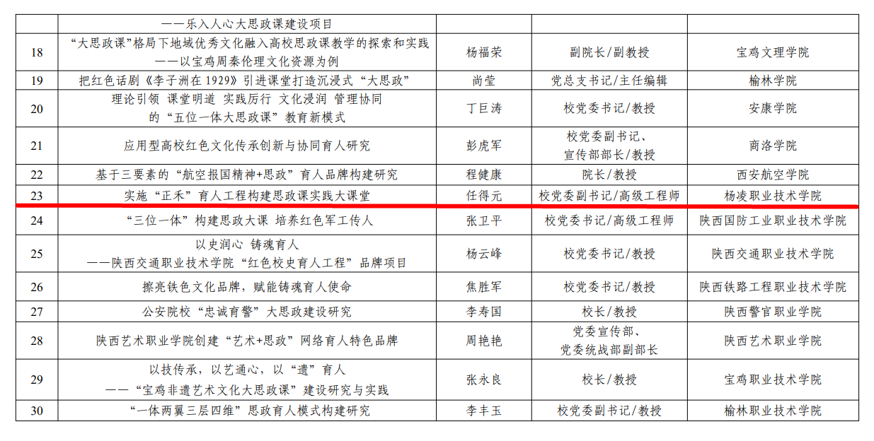 10月28日,省委教育工委、省教育厅对陕西省“大思政课”建设试点项目评审结果进行公示,beat365官网党委书记王周锁牵头负责陕西高校“大思政课”建设协同发展联盟(高职类)建设,党委副书记任得元负责的《实施“正禾”育人工程 构建思政课实践大课堂》入选陕西高校“大思政课”建设“一校一品牌”创建项目。