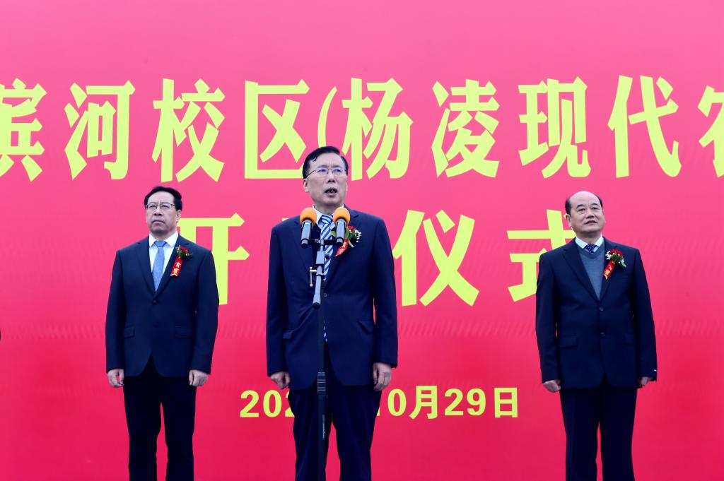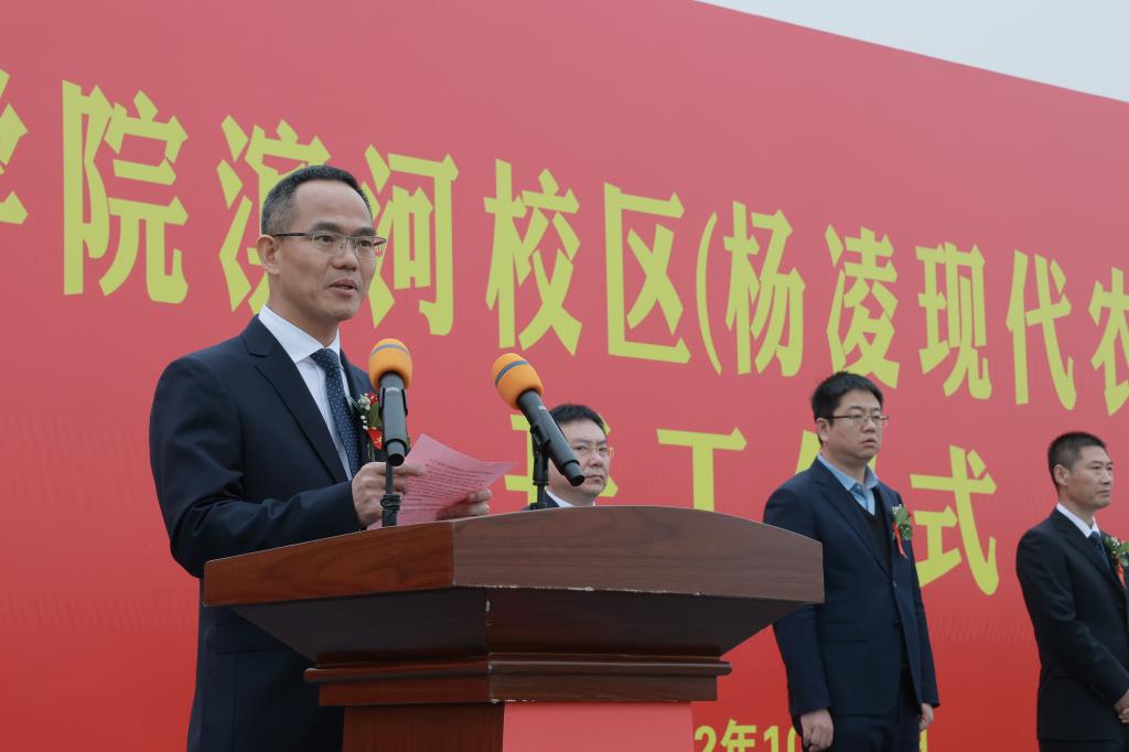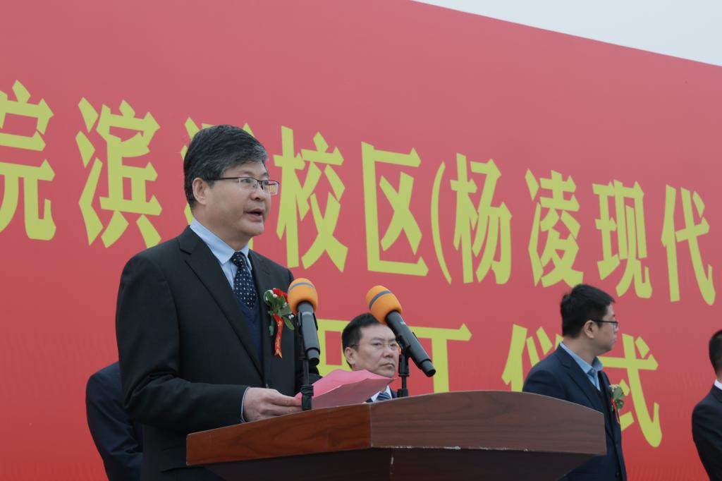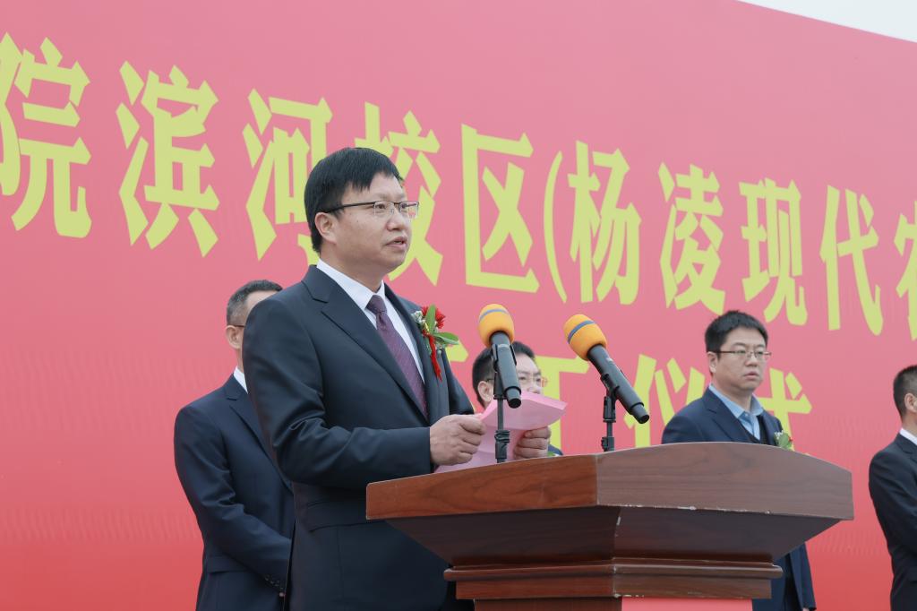 王周锁在致辞中代表学校全体师生向参加滨河校区建设开工仪式的各位领导和嘉宾表示热烈欢迎,向长期以来关心支持学校各项事业发展的各级领导、各界人士和滨河校区参建单位表示诚挚感谢。他指出,滨河校区建设是全体杨职人一直以来的夙愿,承载着学校励志图强的光荣与梦想,是学校推进“双高”建设、升格本科职业大学、实现高质量发展的有力支撑和关键举措。全校上下将认真学习宣传贯彻党的二十大精神,以党的二十大报告中对教育、科技、人才工作的系统阐述为遵循,坚持以立德树人为根本、以强农兴农为己任,扎根杨凌、面向全国、服务世界,紧抓新校区建设这一机遇,全力打造全国农业高职教育新高地,并按照学校“十四五”规划确立的“12468”发展思路,科学实施“六新”方略,深入推进区校融合、产教融合、校企合作,持续优化办学条件,加快建设“中国特色、世界一流职业大学”。