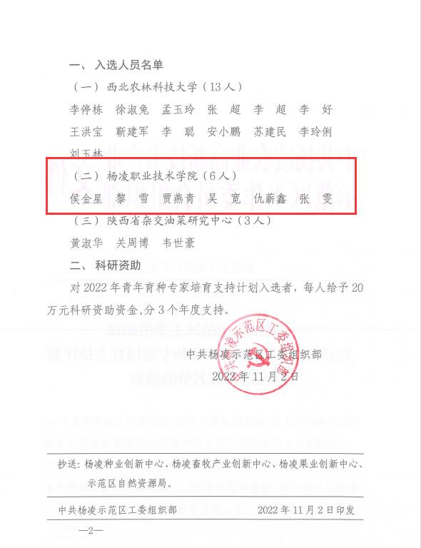 11月3日,杨凌示范区召开青年育种专家座谈会,宣布2022年青年育种专家培育支持计划入选名单,beat365官网侯金星、贾燕青、黎雪、仇薪鑫、吴宽、张雯等6人入选2022年青年育种专家培育支持计划。副校长胡俊鹏出席座谈会,张雯、侯金星代表入选人员做表态发言。