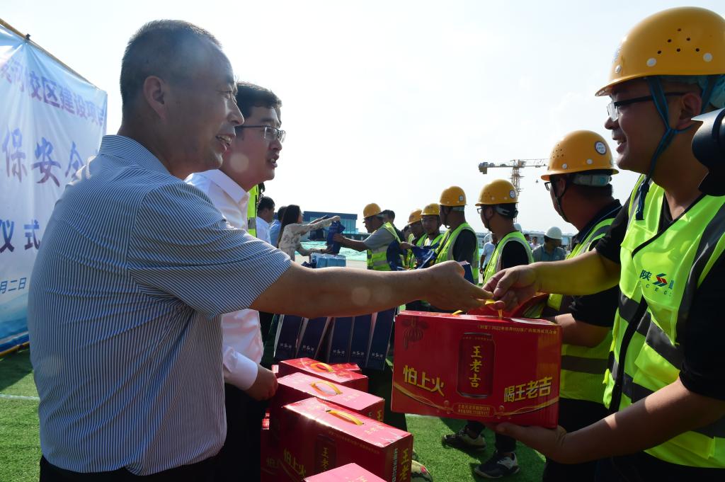 82午,党委副书记任得元,副校长胡俊鹏、张朝晖,中建西北设计院党委副书记赵政工会副主席刘怡二院院长张成刚,中建四局西北公司党委副书记张翼,陕建集团工程六部党总支书记余科以及中建一局西北公司安全总监屈子正等一行来到滨河校区项目施工现场,举行送清凉 保安全”慰问活动,为奋战在一线的工作人员送去防暑降温慰问品