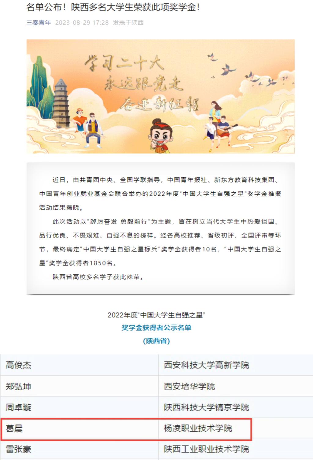 近日,由共青团中央、全国学联指导,中国青年报社、新东方教育科技集团、中国青年创业就业基金会联合举办的2022年度“中国大学生自强之星”奖学金推报活动结果揭晓,beat365官网水利工程学院学生葛晨荣获2022年度“中国大学生自强之星”称号。