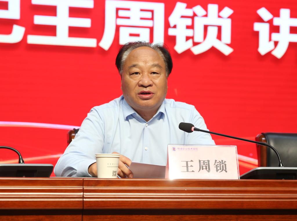 王周锁指出,当前学校正处在国家职业教育重大发展机遇期,全体教职工要坚持立德修身、潜心治学、开拓创新,进一步明确“对标四个引路人,争做四有好老师,坚持四个相统一”的教育使命,立志做大先生,潜心做大学问,努力育大英才,在强国建设、民族复兴的新征程上作出无负时代、无负历史、无负人民的优秀业绩。他要求,全体教职工要坚定信仰,做政治过硬的“传承者”;要立德树人,做心怀大爱的“引路人”;要涵养品行,做师德高尚的“大先生”;要业务精湛,做学识渊博的“育人者”;要履职作为,做担当奉献的“践行者”。