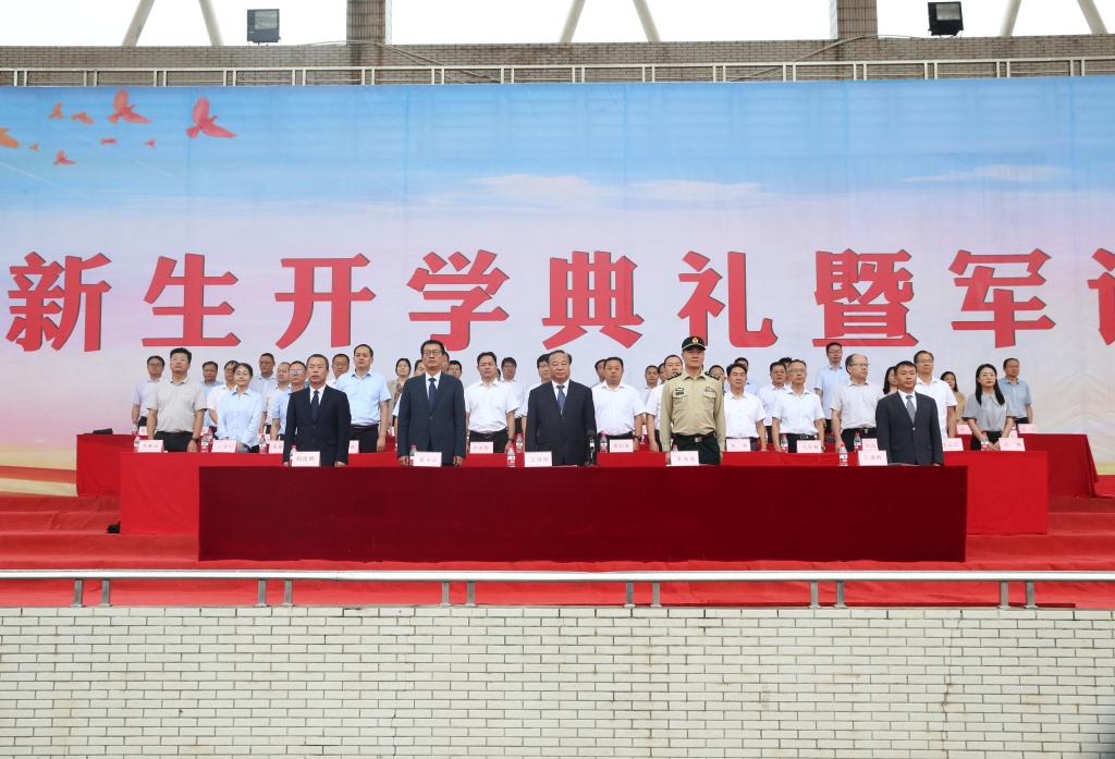 副校长蒋平江、胡俊鹏,省级以上优秀教师、教学名师、师德标兵、杰出人才、三级教授等教师代表,各二级学院、各处室负责同志,2023级新生,以及军训教官等近6000人参加开学典礼暨军训动员大会。