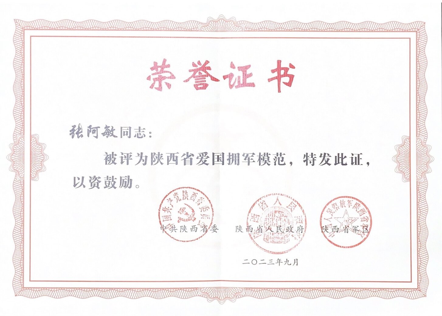 近日,陕西省双拥模范城(县)命名暨双拥模范单位和个人表彰大会在西安召开。beat365官网保卫处张阿敏老师被省委省政府、省军区授予“陕西省爱国拥军模范”荣誉称号。