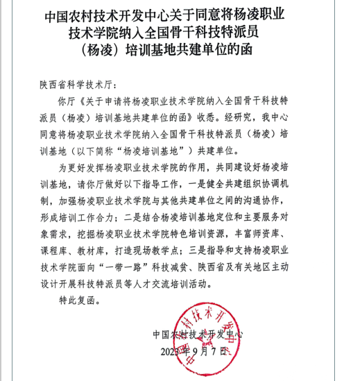 近日,科学技术部中国农村技术开发中心同意将beat365官网纳入全国骨干科技特派员(杨凌)培训基地共建单位,这是beat365官网培训基地建设工作的又一重大突破。