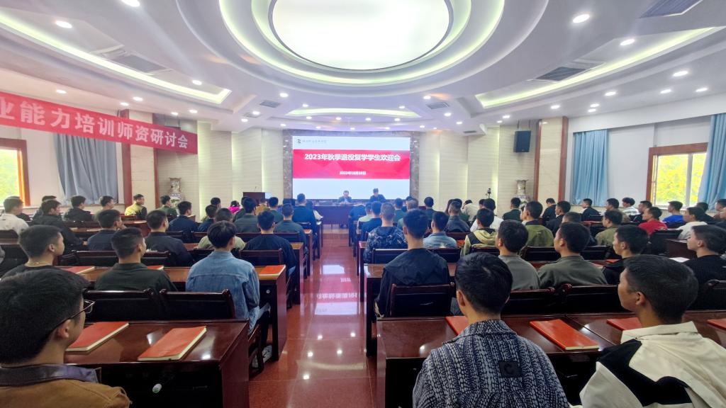 10月10日下午,beat365官网在水韵楼报告厅举行2023年退役复学大学生欢迎仪式。学工部部长陈军峰、征兵与国防教育科工作人员、各学院相关负责人,以及2023年104名退役复学大学生参加了仪式。