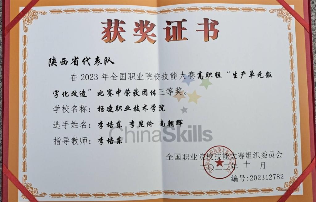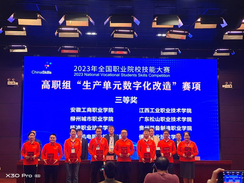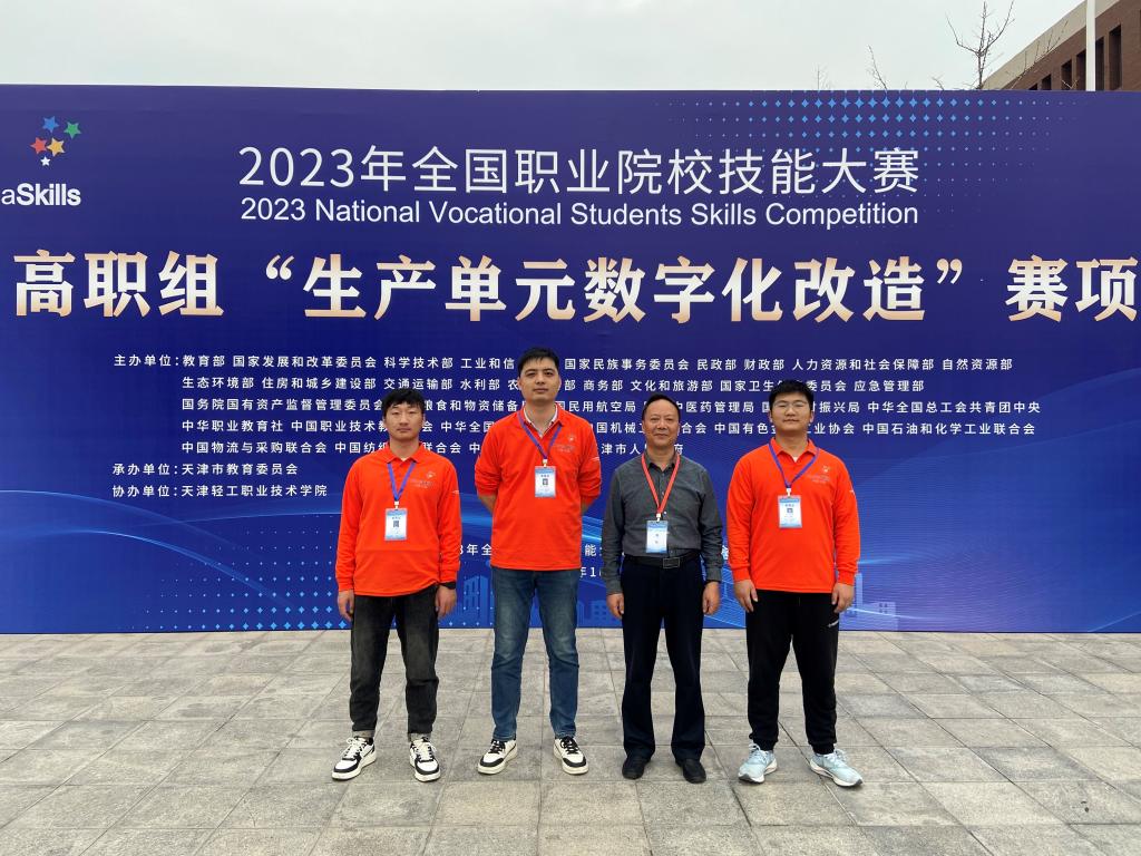 10月11日至13日,2023年全国职业院校技能大赛高职组“生产单元数字化改造(师生同赛)”赛项在天津轻工职业技术学院举办,共有来自全国30个省(市)、自治区的82支代表队、246名选手参加了本次比赛。beat365官网教师李培东和学生李昆伦、南朝辉组成的代表队荣获三等奖。