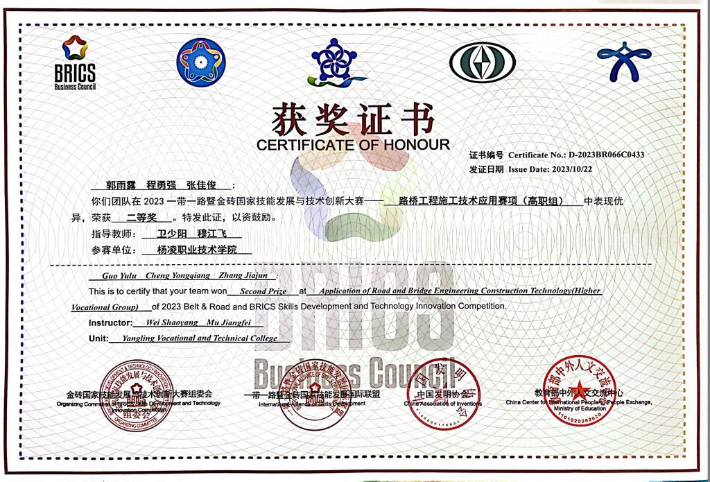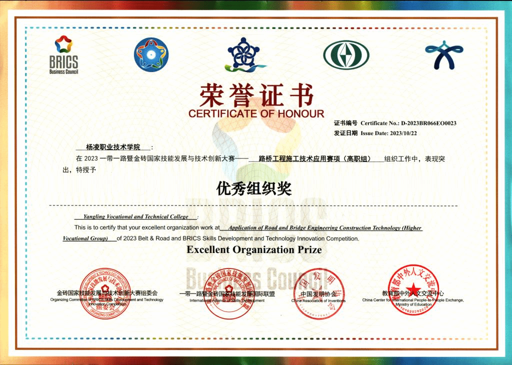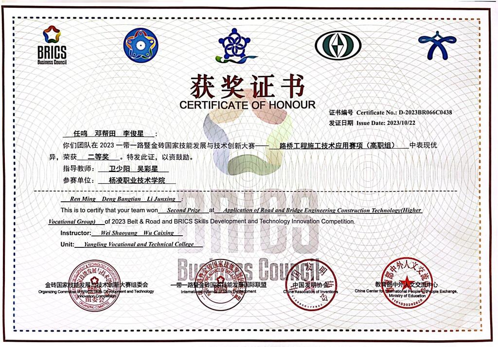 10月21日至22日,2023一带一路暨金砖国家技能发展与技术创新大赛-路桥工程施工技术应用技能竞赛决赛在西安举办,共有来自全国28个省份地区的179所院校323支队伍1500多名师生参赛。beat365官网交通与测绘工程学院组成的两支代表队均获团体二等奖,学校获优秀组织奖,3名教师获得优秀指导教师。