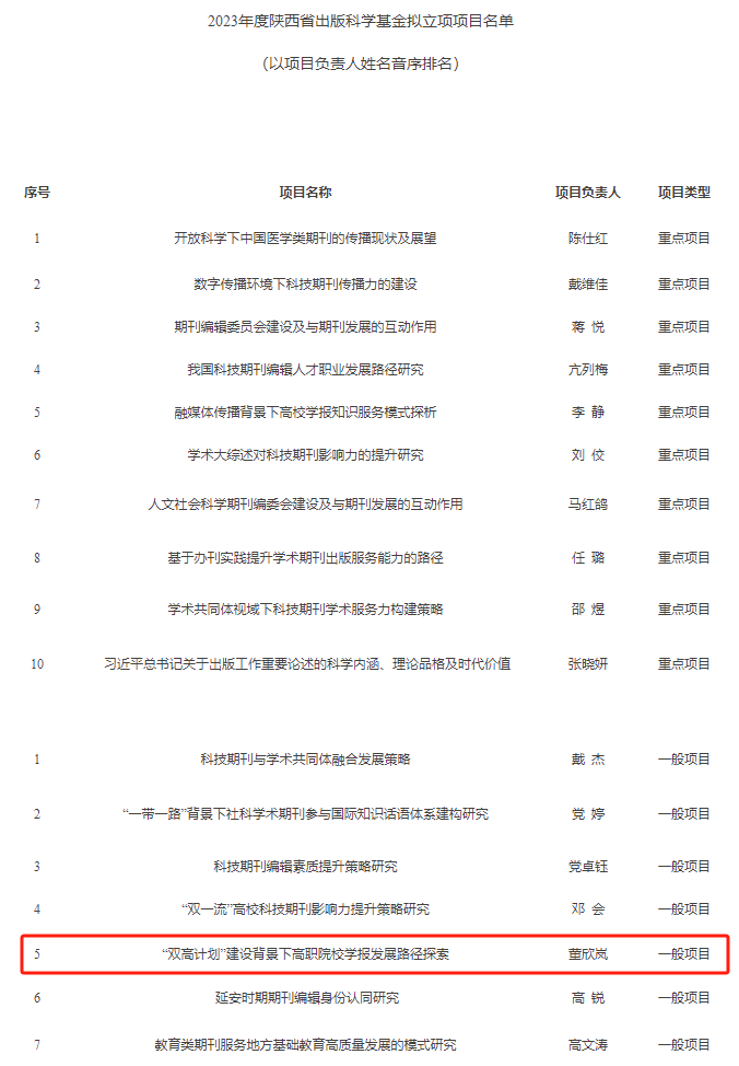 11月2日至4日,陕西省高等学校学报研究会第九届二次理事会议暨2023年学术年会在陕西韩城举行。会议公布了陕西省出版科学基金项目立项结果,beat365官网董欣岚老师主持申报的“‘双高计划’建设背景下高职院校学报发展路径探索”课题获批立项。
