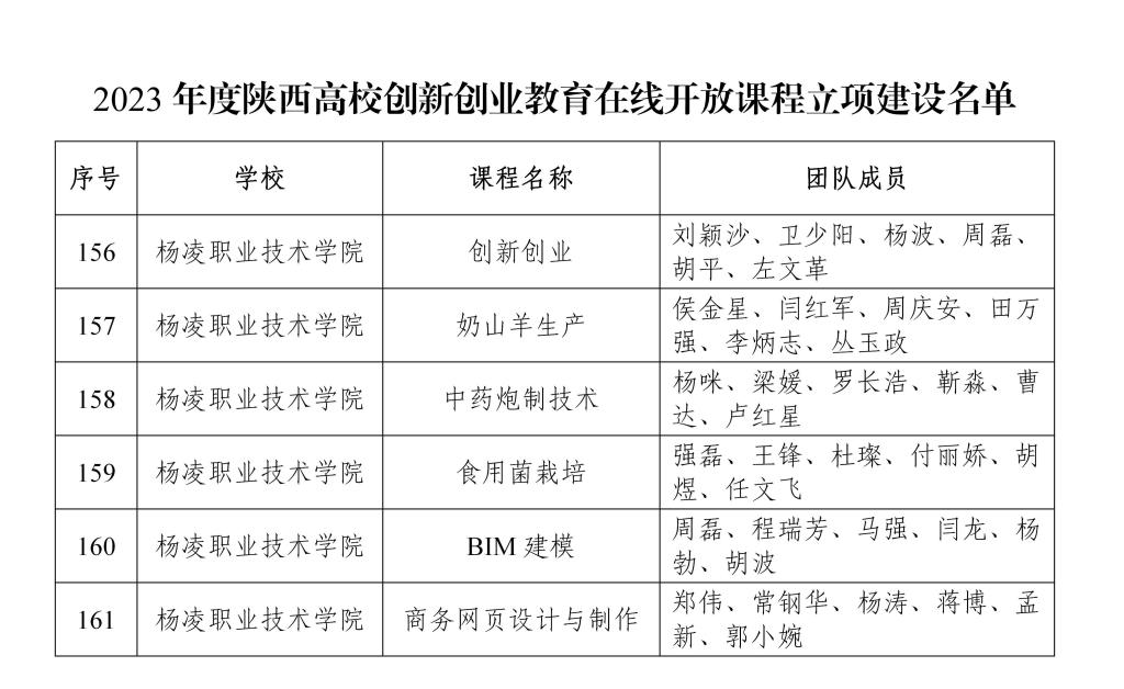 近日,陕西省教育厅公布了2023年陕西高校创新创业教育在线开放课程立项名单,beat365官网创新创业学院刘颖沙主持的《创新创业》、动物工程学院侯金星主持的《奶山羊生产》、药物与化工学院杨咪主持的《中药炮制技术》、生物工程学院强磊主持的《食用菌栽培》、建筑工程学院周磊主持的《BIM建模》、经济与贸易学院郑伟主持的《商务网页设计与制作》等6门课程获批陕西省高校创新创业教育在线开放课程,立项数量及立项率均居同类院校前列。