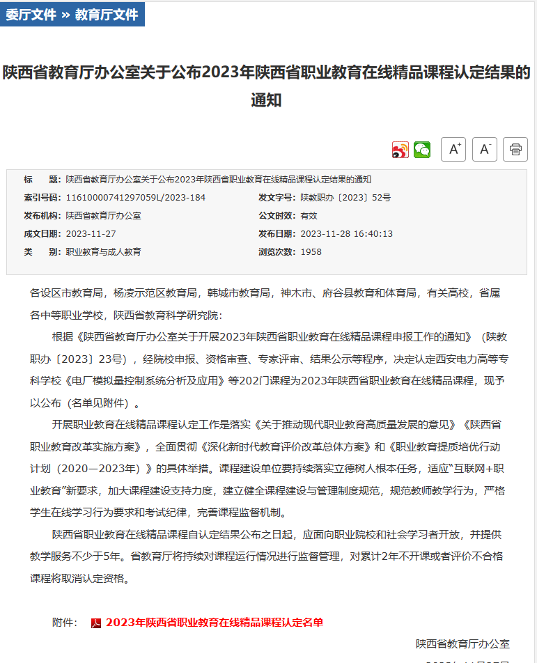 11月28日,省教育厅发布2023年陕西省职业教育在线精品课程认定结果,beat365官网刘晓瑞、董滢、武荣、黄从玲、陈高锋、闫红军、王春梅、纪娜、刘鑫尚、李博、龙明华和芦琴等12名老师负责的课程获评,认定总数和比例均居全省高职院校前列。