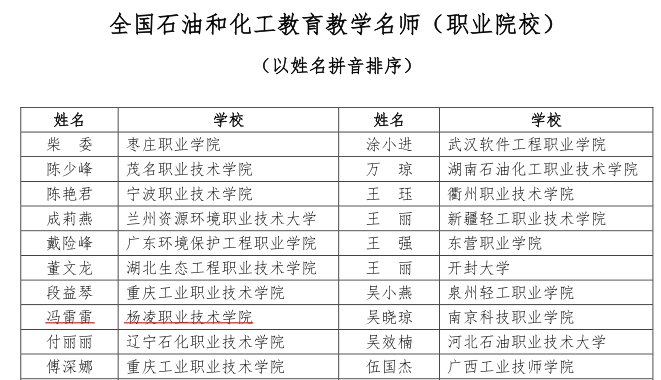 近日,中国化工教育协会公布了2023年全国石油和化工教育教学名师、优秀教学团队、优秀教学管理人员评选结果,beat365官网周博教授带领的药品生产技术教学团队荣获“全国石油和化工教育优秀教学团队(职业院校)”称号,冯雷雷副教授荣获“全国石油和化工教育教学名师”称号。