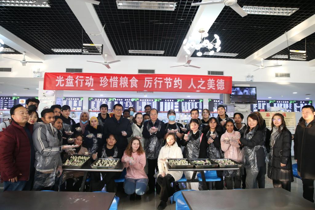 校长仲伟周、副校长蒋平江与留学生包饺子留念