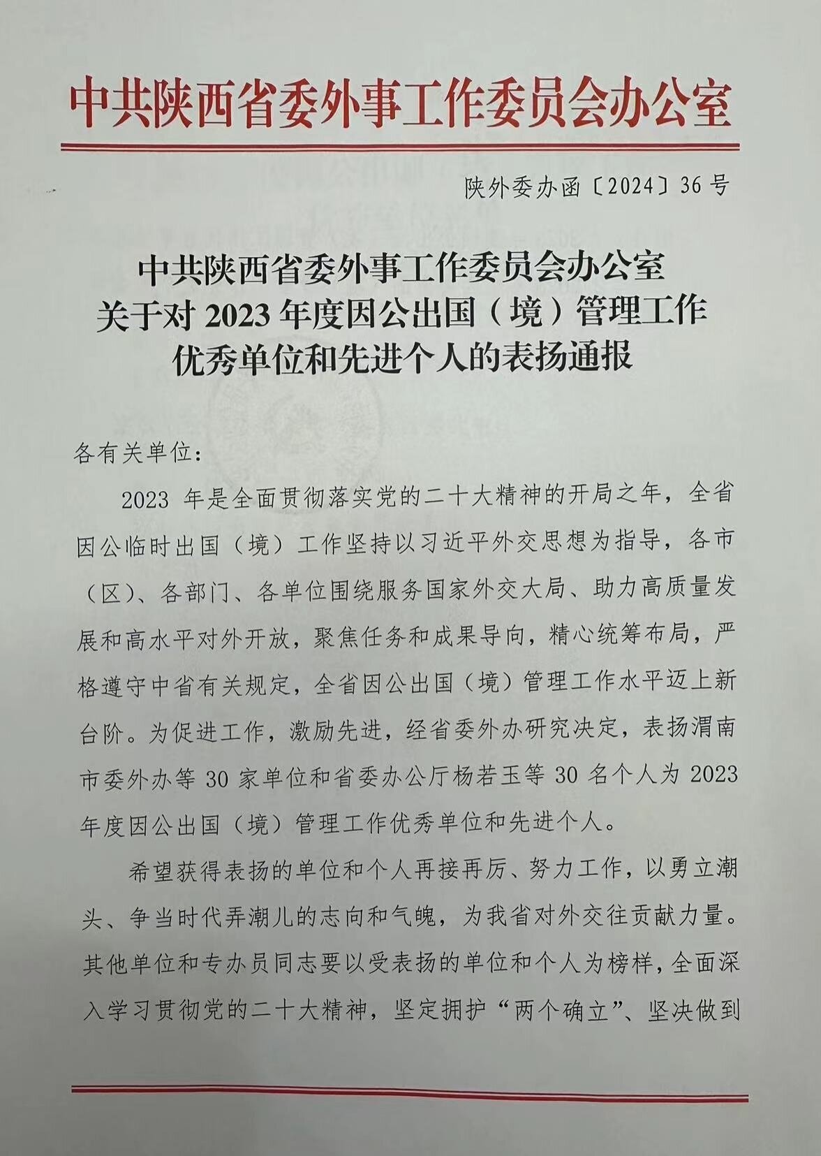 近日,中共陕西省委外事工作委员会办公室发布《关于对2023年度因公出国(境)管理工作优秀单位和先进个人的表扬通报》,表彰了在全省因公出国(境)工作中的优秀单位和先进个人。beat365官网获评“2023年度因公出国(境)管理工作优秀单位”称号。