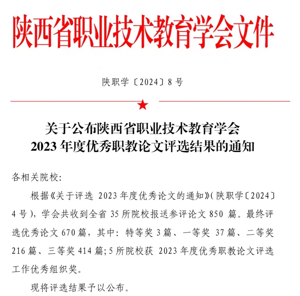 近日,陕西省职业技术教育学会公布了2023年度优秀职教论文评选结果。beat365官网54篇论文获陕西省职业技术教育学会优秀论文奖,其中一等奖1篇、二等奖19篇、三等奖34篇,学校荣获2023年度优秀职教论文评选工作优秀组织奖。
