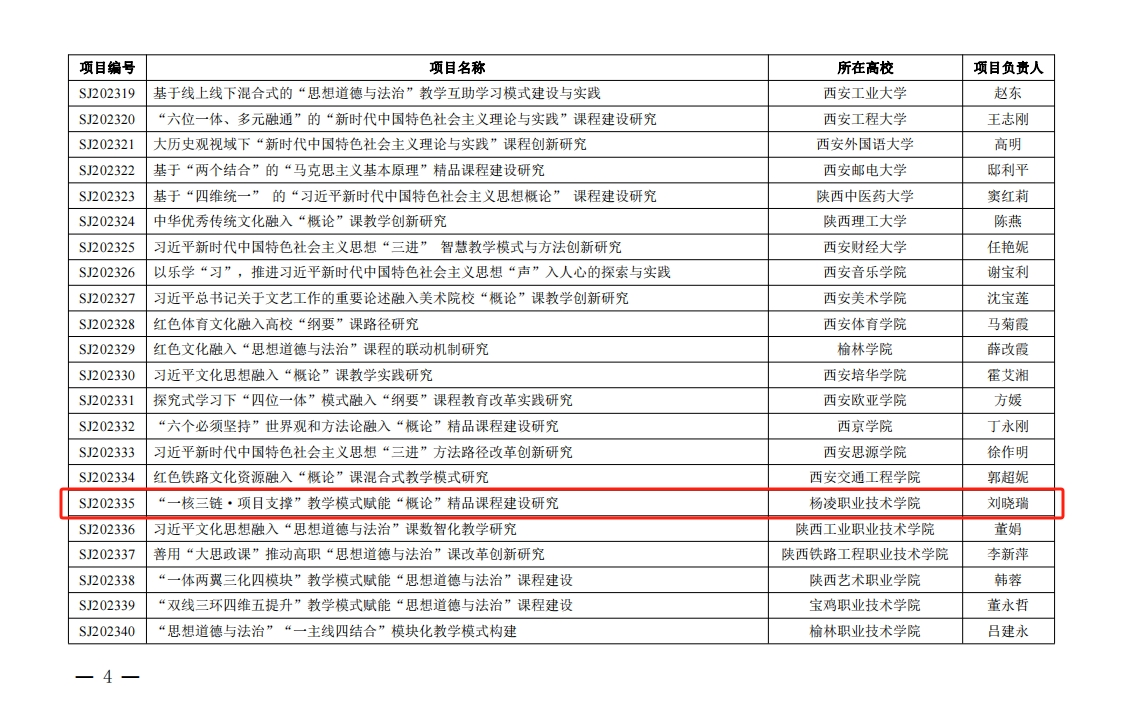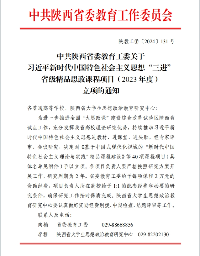 4月3日,陕西省委教育工委公布了2023年度习近平新时代中国特色社会主义思想“三进”省级精品思政课程项目立项名单,beat365官网马克思主义学院刘晓瑞副教授主持的《“一核三链·项目支撑”教学模式赋能“概论”精品课程建设研究》获批立项。