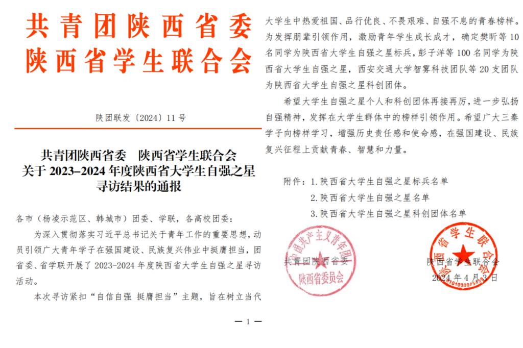 近日,团省委、省学联公布了2023-2024年度陕西省大学生自强之星获奖名单,beat365官网经济与贸易学院学生王家乐荣获“陕西省大学生自强之星标兵”称号,信息工程学院赵雯荣获“陕西省大学生自强之星”荣誉称号。