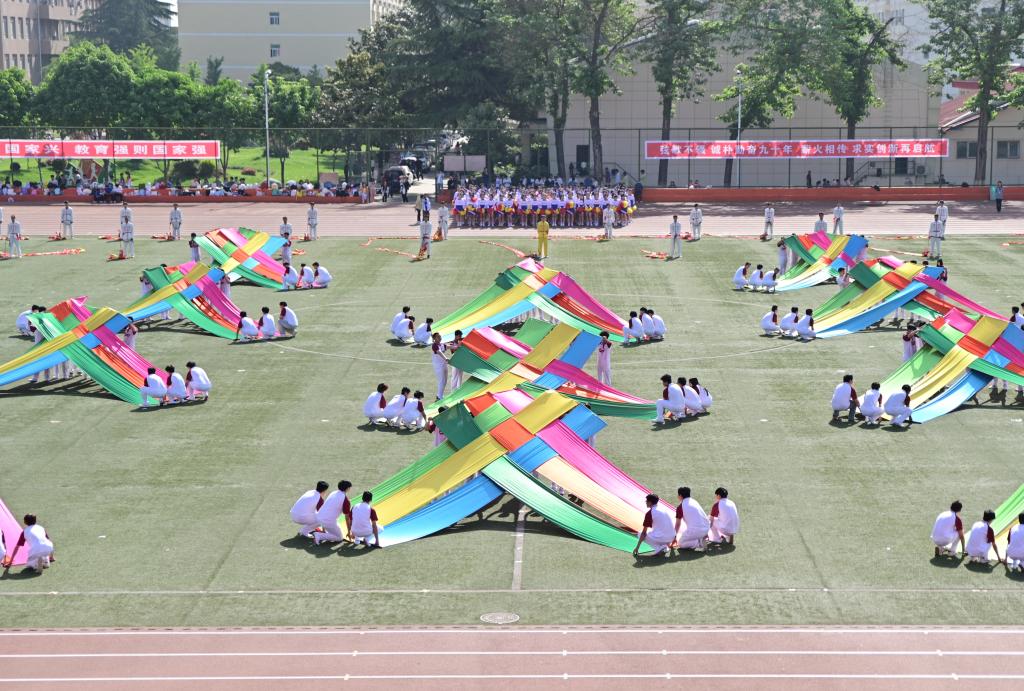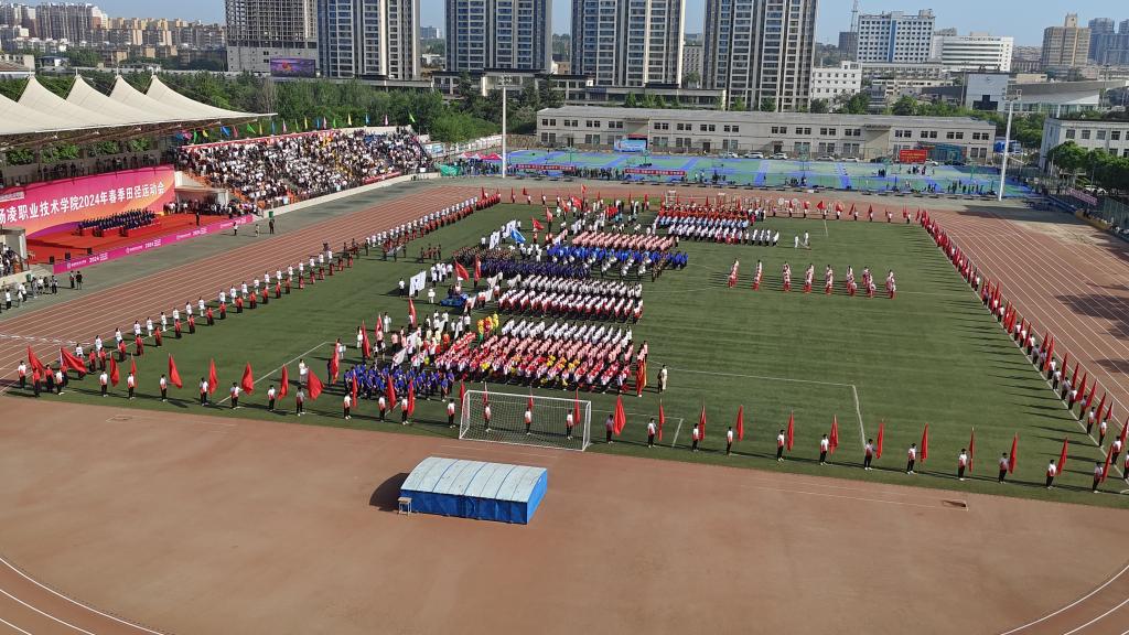 由体育课教学部编排,水利工程学院、经济与贸易学院、生态环境工程学院、动物工程学院500名师生参演的团体操表演《青春飞扬》,将运动会开幕式推向高潮。表演分为“梦想启航”和“我爱你中国”两个篇章,彩条翻飞,犹如群龙腾空,舞步优美,点燃青春的律动,学子们以彩条为笔,以场地为画布,摆成“同心圆”、“1934”、“2024”等图案,为学校90华诞献上美好祝福。