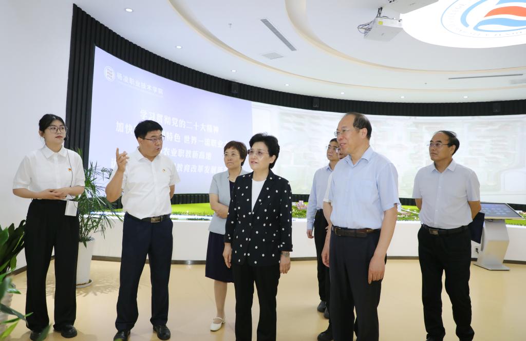 邢善萍参观了学校校史馆、耕读文化馆,详细了解学校的办学历史、专业特色、党建工作、发展成就和服务地方经济社会发展方面取得的成绩,以及学校以弘扬“后稷文化”为主线,开展新时代耕读教育创新实践的经验做法。在水工监测大厅,邢善萍实地察看,并听取了水利工程专业群建设和实训教学情况汇报。