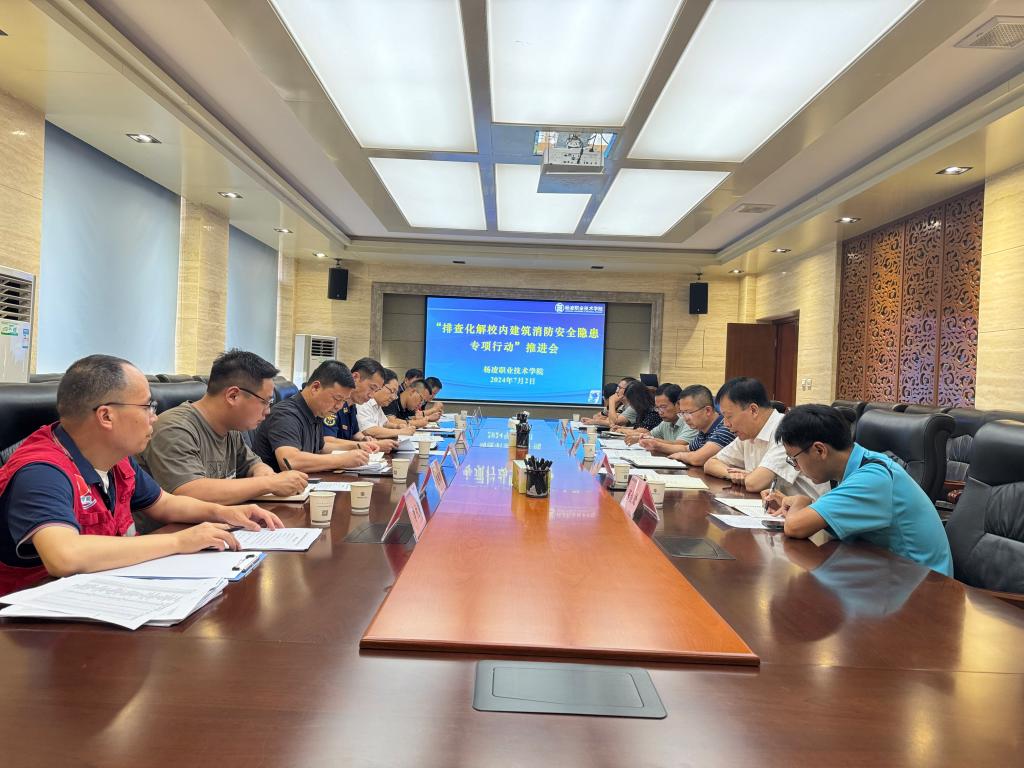 7月2日下午,学校召开排查化解校内建筑消防安全隐患专项行动推进会。副校长张朝晖,杨凌示范区消防救援支队支队长李林,住建局副局长田文志,质监站站长朱育方,企业负责人等出席会议。