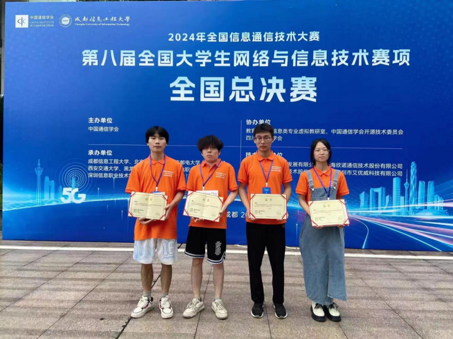 本次大赛共有来自全国500多所本科院校及高职院校的1万多名学生参加。在学校的大力支持下,由信息工程学院负责人陈高锋带队,带领四名学生参加5G网络工程实践赛项,经过激烈角逐和严格评审,现代通信技术专业学生樊勇杰获国赛一等奖,南疆、陈维浩、吴莉彤获国赛二等奖。