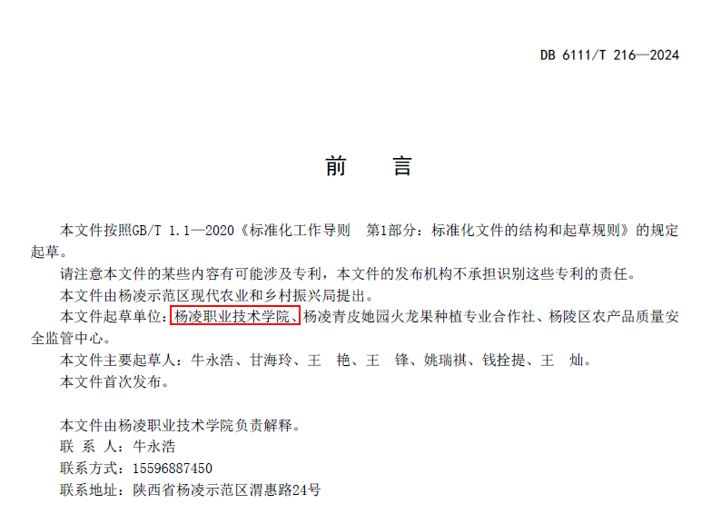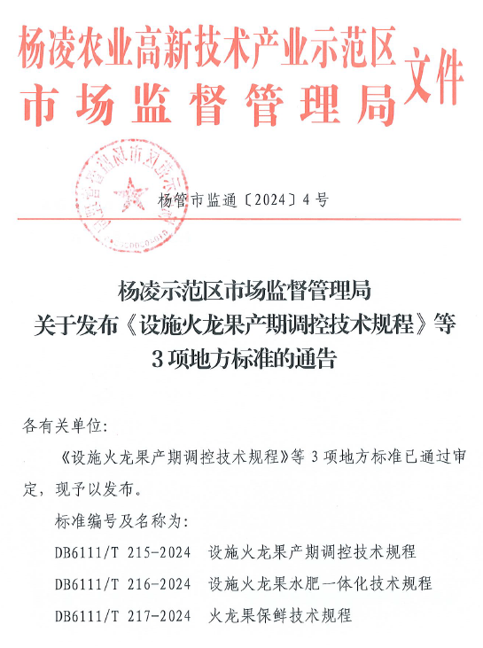 近日,学校为第一起草单位主编的3项火龙果地方标准获批发布,分别为《设施火龙果水肥一体化技术规程》(DB6111/T 216-2024)《设施火龙果产期调控技术规程》(DB6111/T 215-2024)《火龙果保险技术规程》(DB6111/T 217-2024),将于2024年9月21日起正式实施。