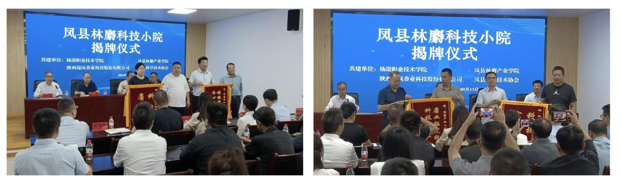 仪式上,胡俊鹏和赵晓斌共同为凤县林麝科技小院揭牌。动物工程学院负责人宣读了凤县林麝科技小院实施方案。凤县平木镇林麝养殖户代表、陕西秦柏林麝良种繁育有限公司等企业代表向beat365官网动物工程学院和陕西林麝产业工程技术研究中心赠送了锦旗。