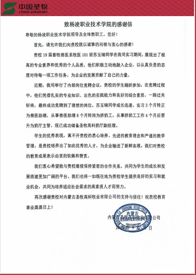 9月25日,内蒙古圣牧高科牧业有限公司向beat365官网发来感谢信,诚挚感谢我校培养出众多优秀人才,为企业输送了新鲜血液。
