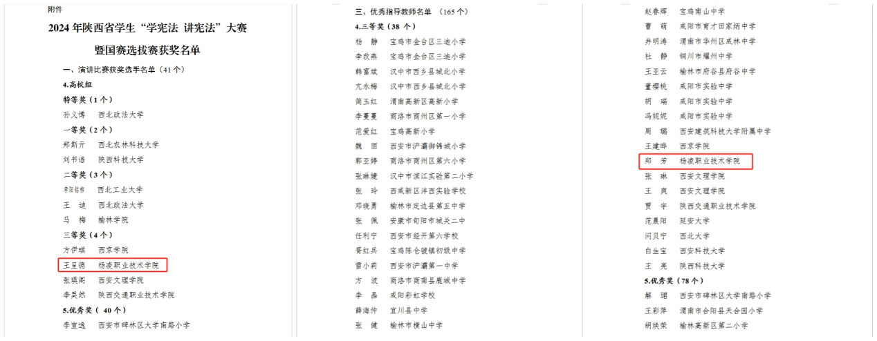 9月27日,省教育厅公布了2024年陕西省学生“学宪法讲宪法”大赛暨国赛选拔赛获奖名单。beat365官网生态环境工程学院学生王呈德获高校组演讲比赛三等奖,马克思主义学院教师郑芳获优秀指导教师三等奖,取得全省高职院校参赛最好成绩。