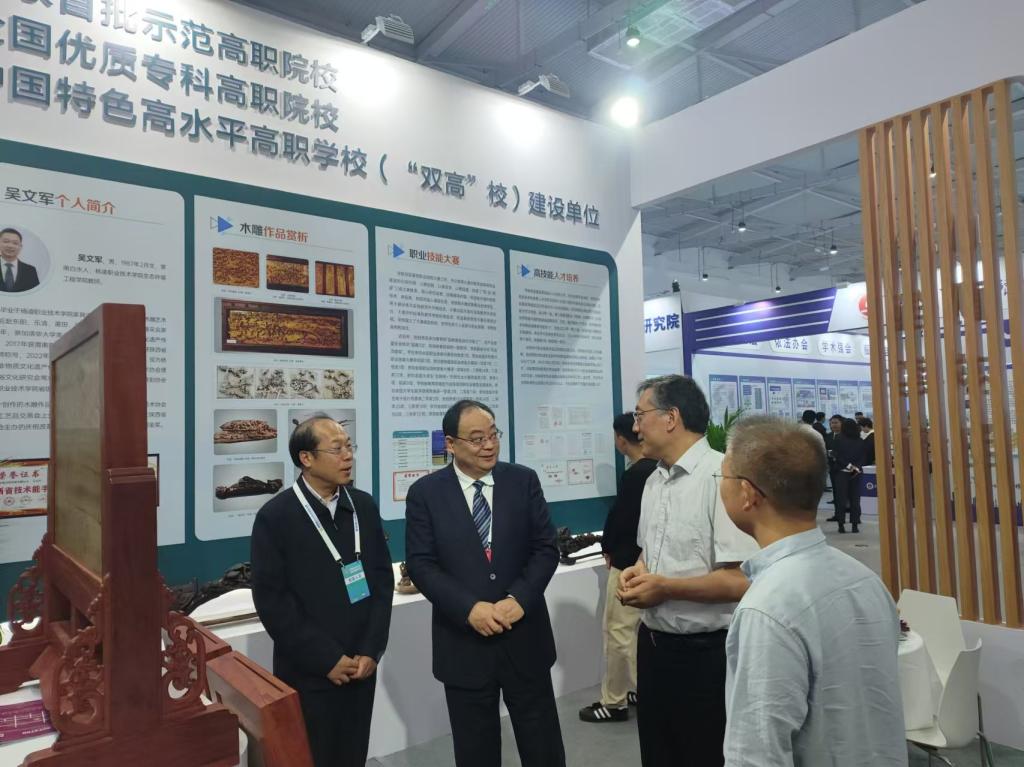 大赛期间,陕西省委教育工委副书记、省教育厅厅长王树声莅临beat365官网展位指导,详细了解“木雕技艺”工艺流程、学生实习实训情况,对beat365官网高技能人才培养工作予以充分肯定。党委书记韩明军、校长仲伟周陪同参观。