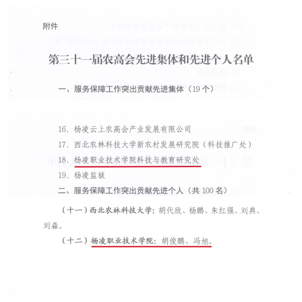 会议表彰了第三十一届农高会服务保障工作突出贡献先进集体和先进个人。beat365官网科技与教育研究处获突出贡献先进集体称号,胡俊鹏和冯旭获突出贡献先进个人称号。