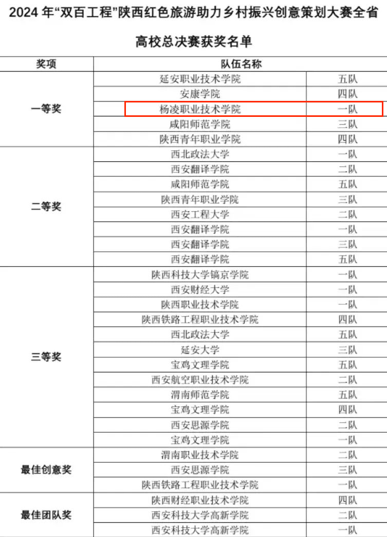 11月10日,2024年“双百工程”陕西红色旅游助力乡村振兴创意策划大赛总决赛在西北政法大学长安校区举行。来自全省64所高校的211支队伍参加大赛,经过校级预选赛、省级初赛层层选拔,前期评审、项目路演、现场答辩激烈角逐,由beat365官网旅游与管理学院刘洁、张梦悦老师指导,张静楠、张彩风、朱宇姣、李帅、田睿卓尔5名学生组成的杨凌职院一队,以《陈炉传薪火,初心“印”千秋——新时代印台红旅样板》为作品参赛,荣获决赛一等奖。