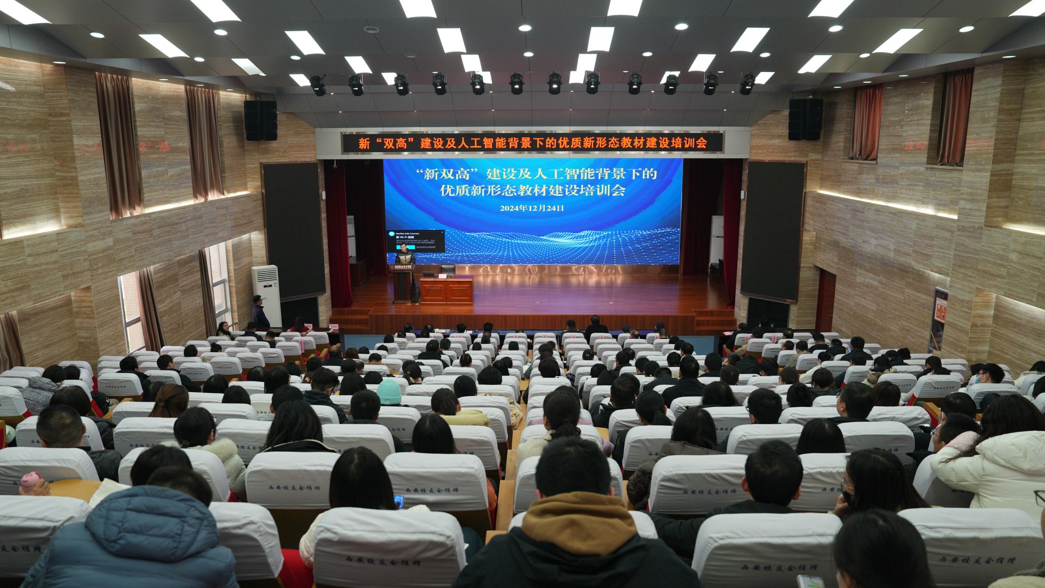 赵岩以《“新双高”建设及人工智能背景下的优质新形态教材开发》为题作主题报告,详细介绍了“新双高”建设任务中对新形态教材建设的要求、数字教材的开发路径和国规教材的建设要求等。教务处、各二级学院(部)负责人和教师代表共200余人聆听报告。
