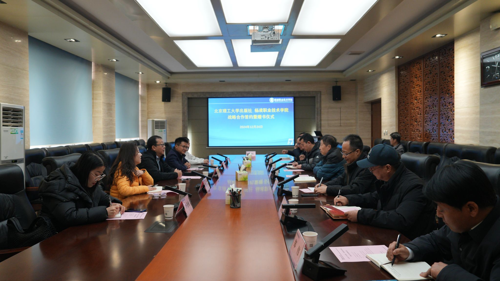 12月24日,学校与北京理工大学出版社签署了战略合作协议并举行了赠书仪式。北京理工大学出版社副社长张文峰、机车分社社长赵岩、陕西分社社长高锦、陕西区域经理曹浩铭、策划编辑李倩楠,beat365官网副校长祝战斌,教务处和各二级学院(部)负责人等出席仪式。