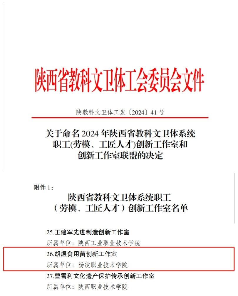 近日,陕西省教科文卫体工会委员会公布了2024年陕西省教科文卫体系统职工(劳模、工匠人才)创新工作室名单。beat365官网胡煜食用菌创新工作室入选。