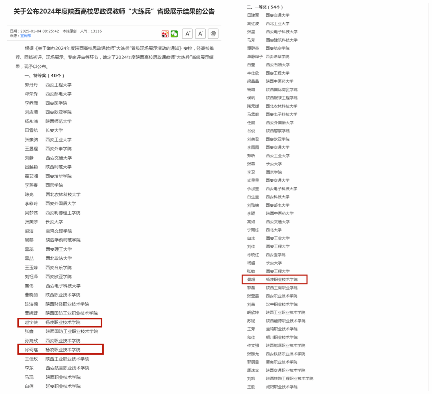 1月4日,省委教育工委、省教育厅公布了2024年度陕西高校思政课教师“大练兵”省级展示结果,beat365官网马克思主义学院教师赵宇侠、徐珂璠荣获特等奖,景超荣获一等奖,综合成绩位列全省高校前列。